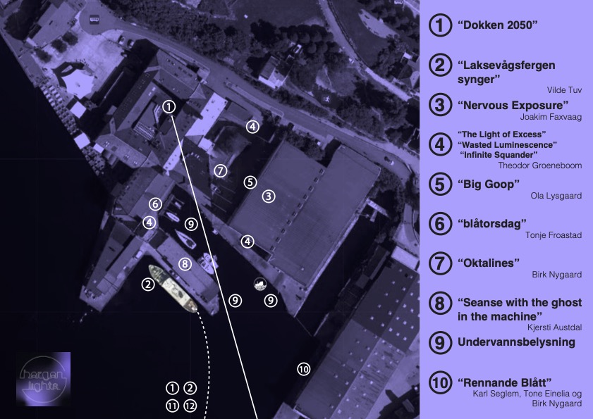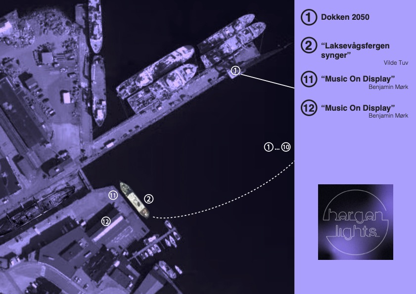 I Hallen USF blir det, i samarbeid med Ekkofestivalen, en innendørs lys- og lyd-installasjon av Joakim Faxvaag. På utsiden vil du finne en rekke videoprojiseringer. Et par mindre lysinstallasjoner, undervannsbelysning og «Laksevågsfergen» tar deg til Smien hvor det er mer å se!