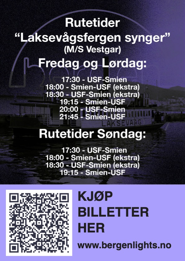 Prosjektet «Laksevågsfergen synger» frakter publikum til og fra USFs naboarena «Smien» på andre siden av Puddefjorden. Der er området lyssatt og den lokale arrangøren serverer mat og drikke. På kaien utenfor plasserer vi en solid lysinstallasjon på utlån fra kulturby Bodø 2024. Inne i selve Smien vil publikum kunne oppleve en audiovisuell konsertforestilling to ganger pr dag (obs: 1 gang på søndag).